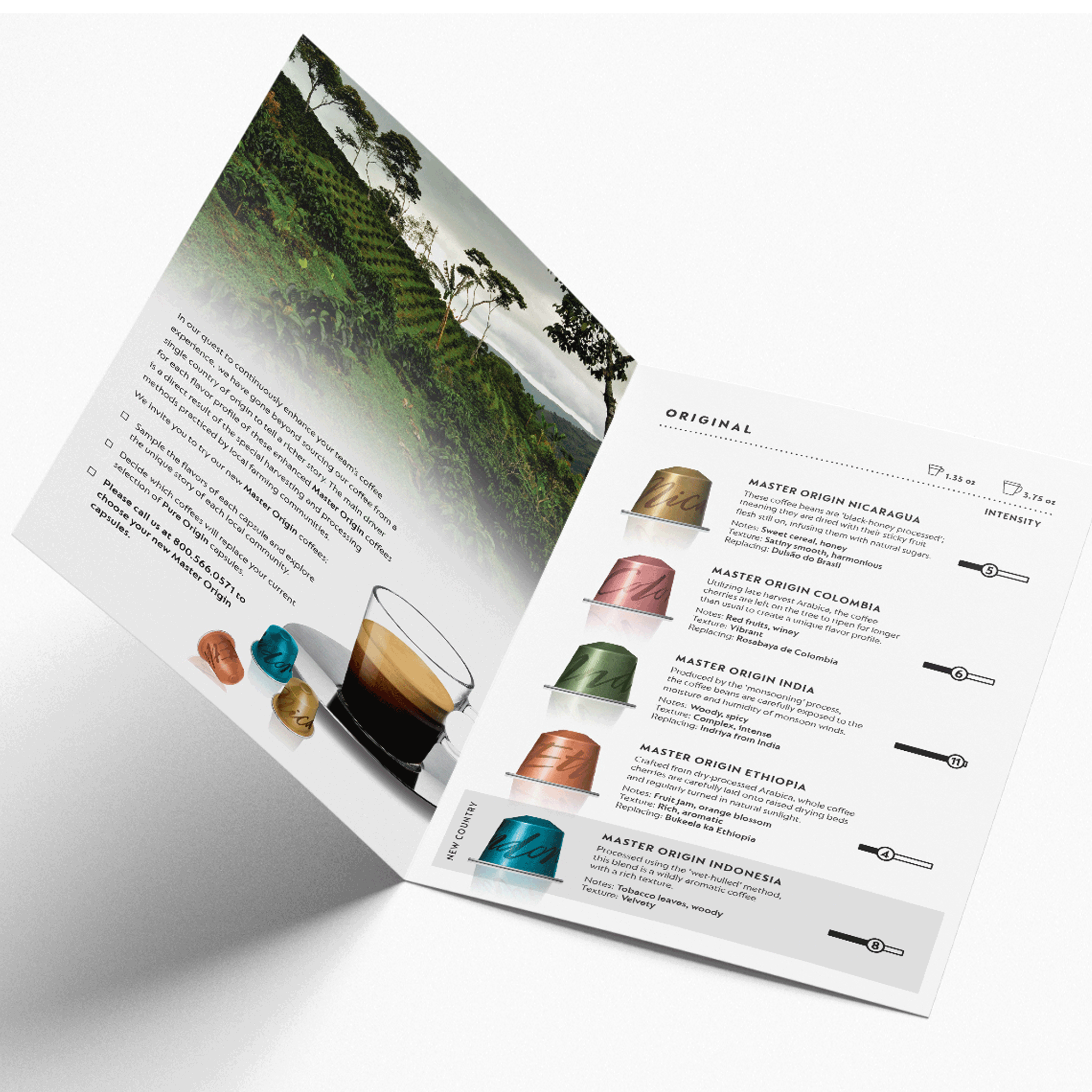 I provided design support to various launches or similar promotions. For the Master Origins line shown below, I composited the capsule images to be used as a brand asset. This allowed for isolated product images use in items like menus, brochures and the social media animation featured below.